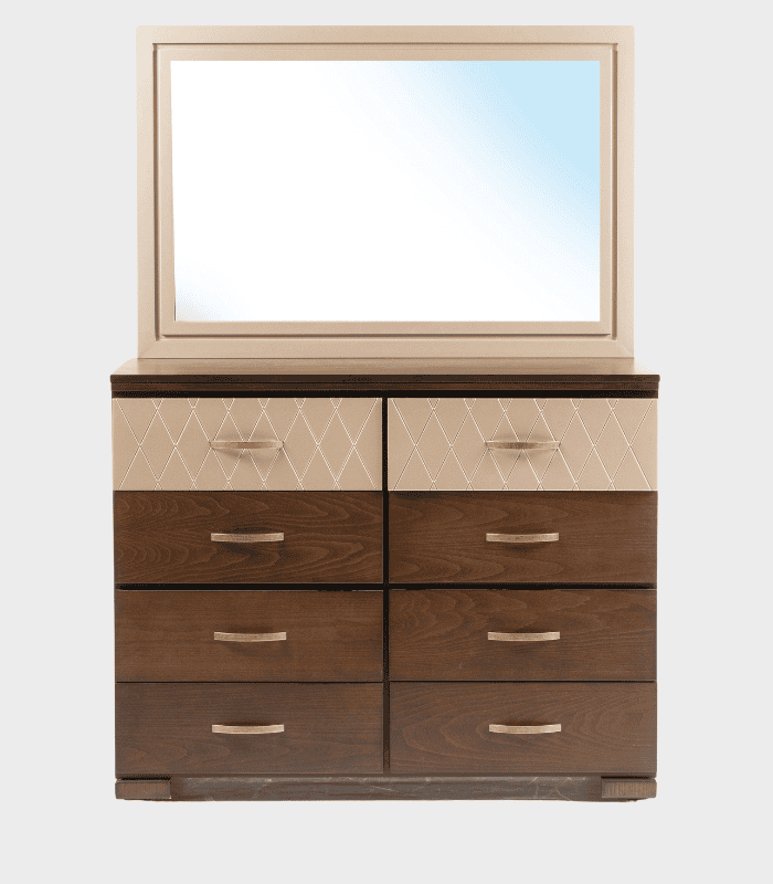 La cómoda Londres combina funcionalidad y diseño moderno en una estructura elegante y bien proporcionada. Sus ocho cajones espaciosos permiten organizar con comodidad accesorios, maquillaje y objetos personales, mientras que los detalles geométricos en relieve en los cajones superiores aportan un toque decorativo que realza cualquier ambiente. Esta pieza ha sido diseñada para ofrecer practicidad sin sacrificar la estética, convirtiéndola en una excelente opción para tu dormitorios.